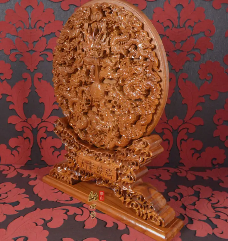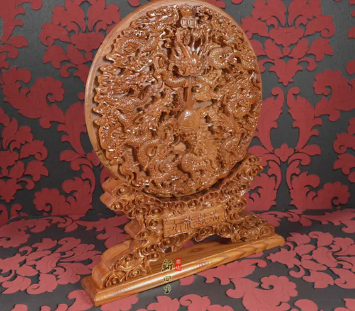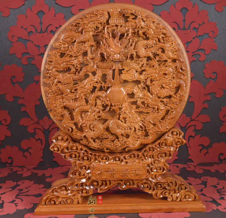 42cm China peach wood handwork Feng Shui carved nine dragons wall plate Statue